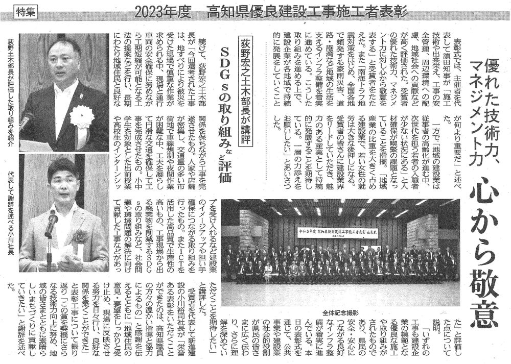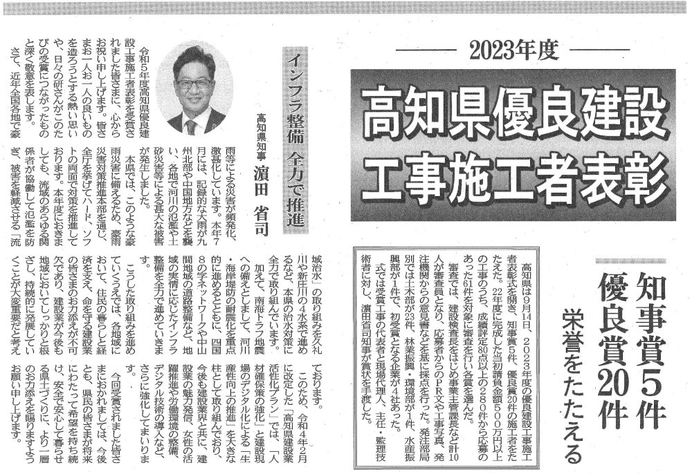 令和5年度 高知県優良工事施工者表彰を受賞しました
