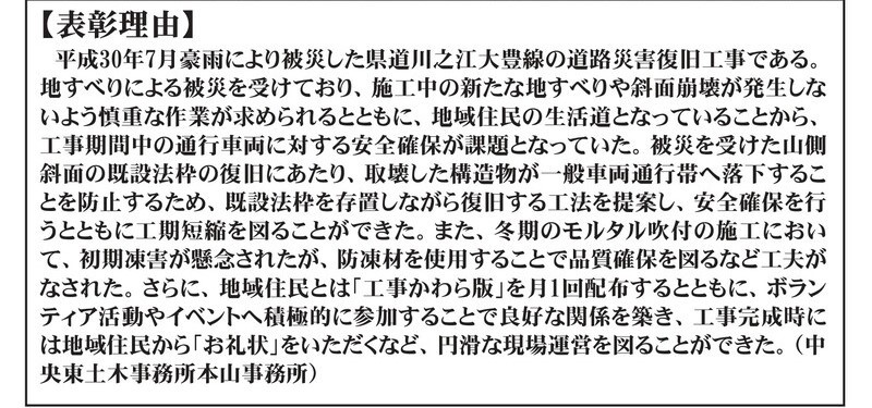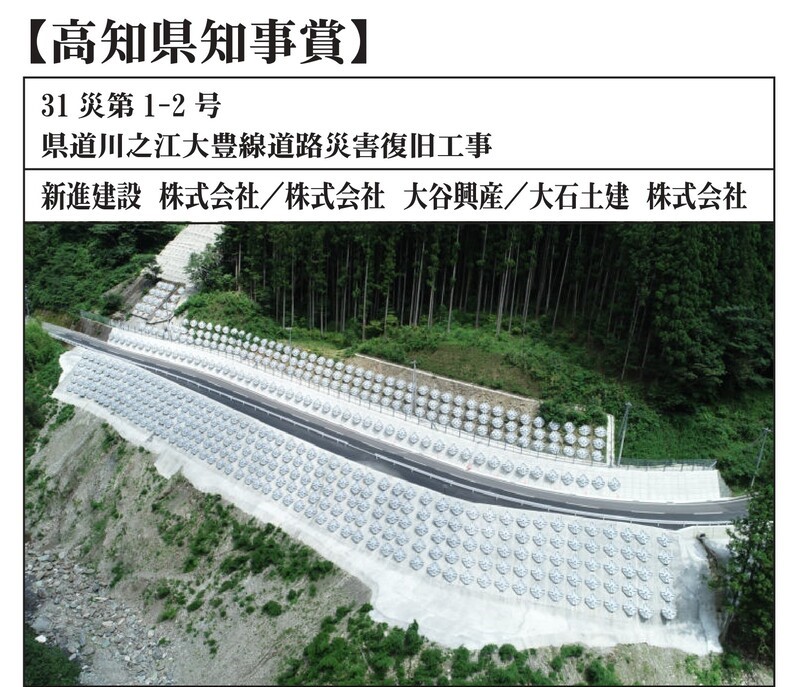 令和4年度に完成した高知県発注工事のうち、優秀な成績〔成績評定80点以上〕の工事280件の中、応募のあった61件を対象とした審査の結果、当社JV(新進・大谷・大石特定建設工事共同企業体)が担当しました「31災第1-2号 県道川之江大豊線道路災害復旧工事」が高知県知事賞を受賞いたしました🎉