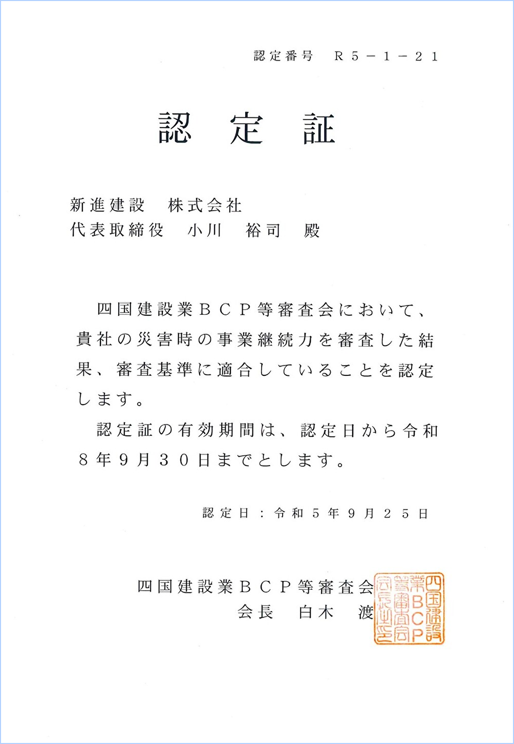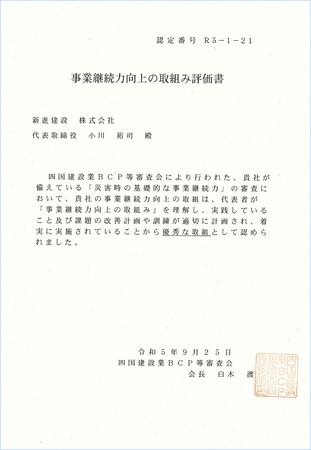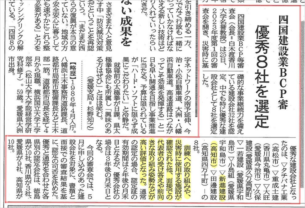 四国建設業BCP等審査会において「優秀会社」として選定されました