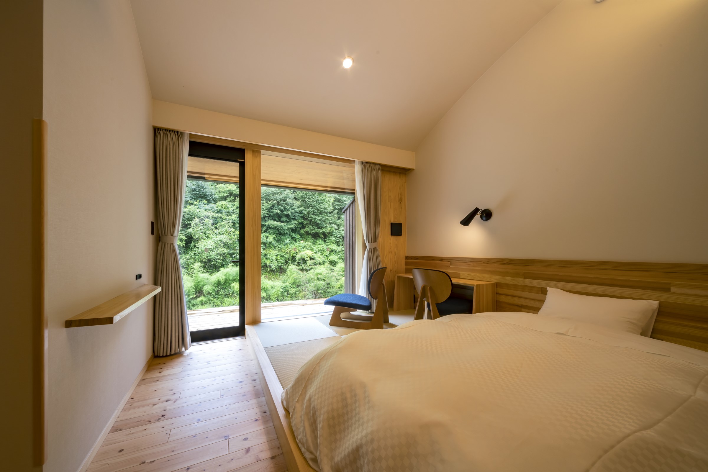 和モダンで落ち着きのある客室からは、四万十川源流のせせらぎが楽しめます。