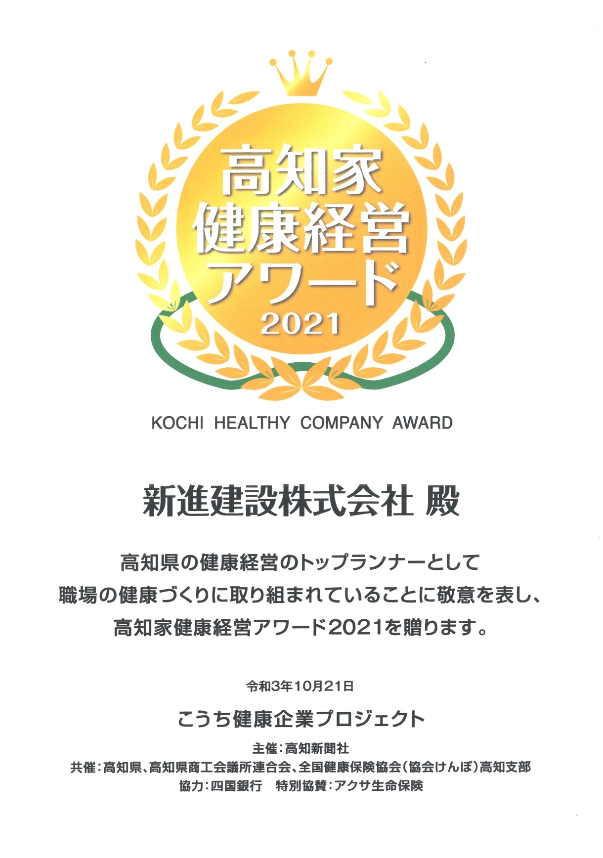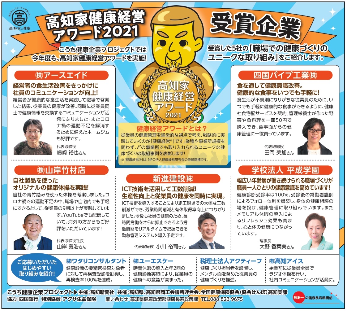 今年も、職場での健康づくりのユニークな取り組みをおこなっている企業を表彰する「高知家健康経営アワード2021」が設けられ、この度、当社の次の取り組みが評価され受賞いたしました。