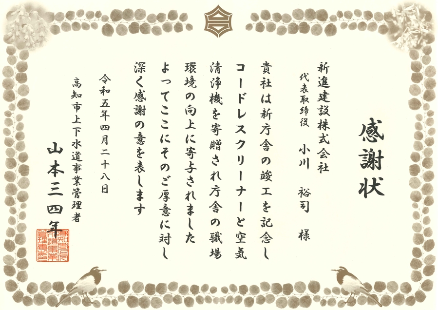 上記に対し、高知市上下水道局 山本 三四年管理者より感謝状を拝受いたしました。