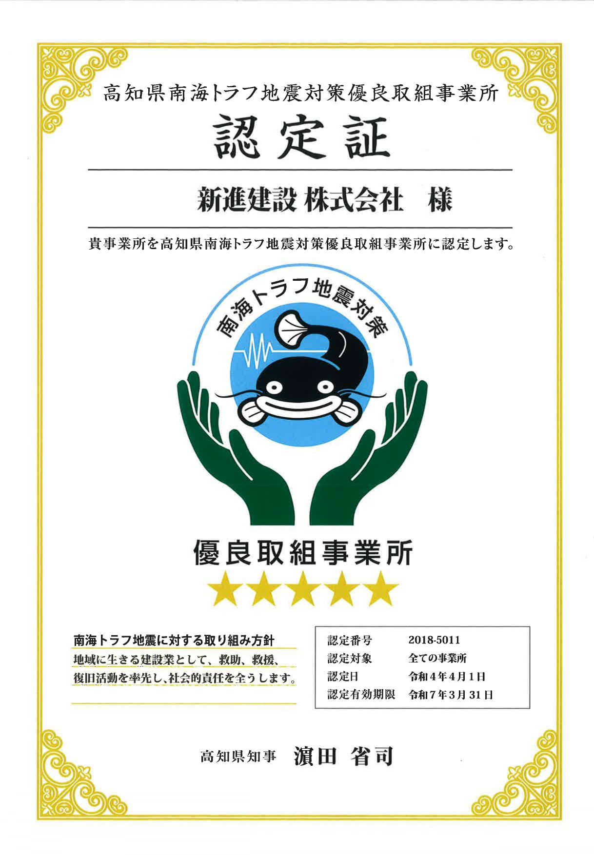 高知県南海トラフ地震対策優良取組事業所の5つ★認定をいただきました