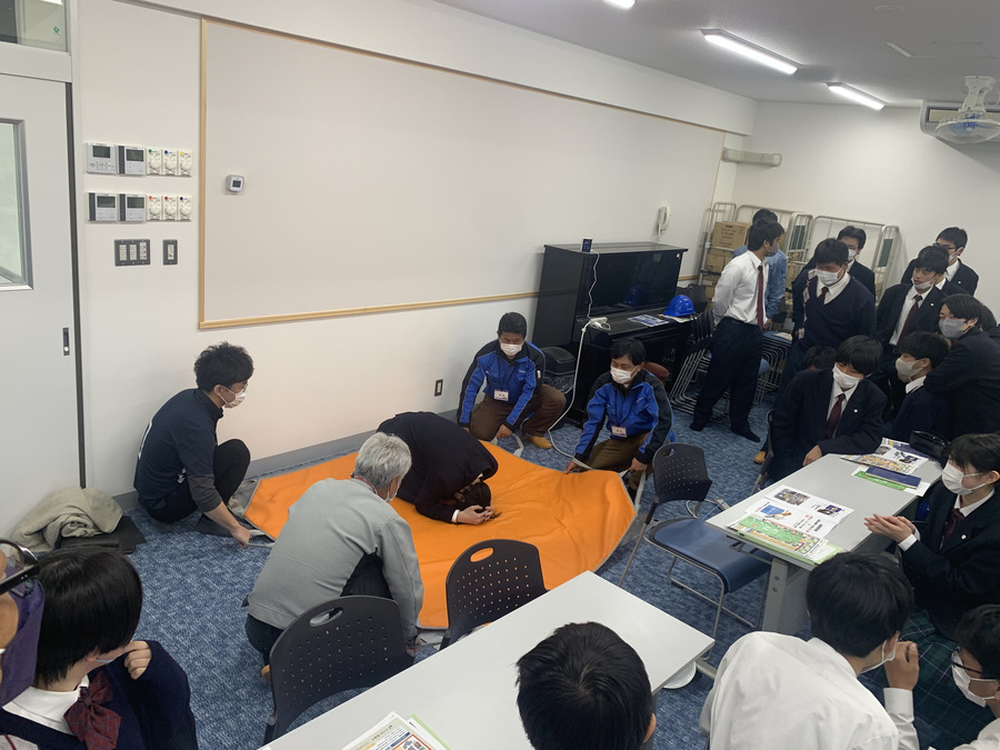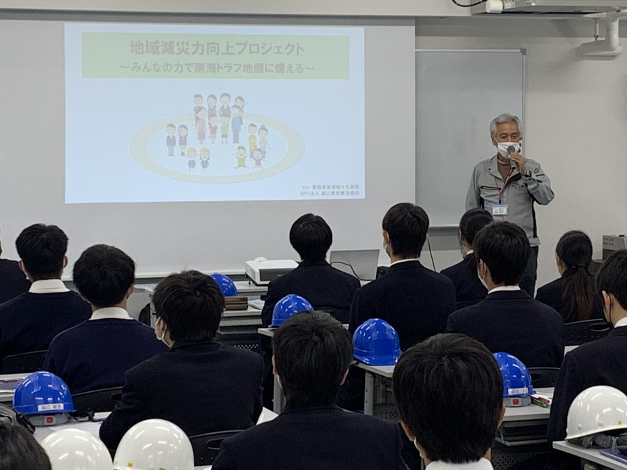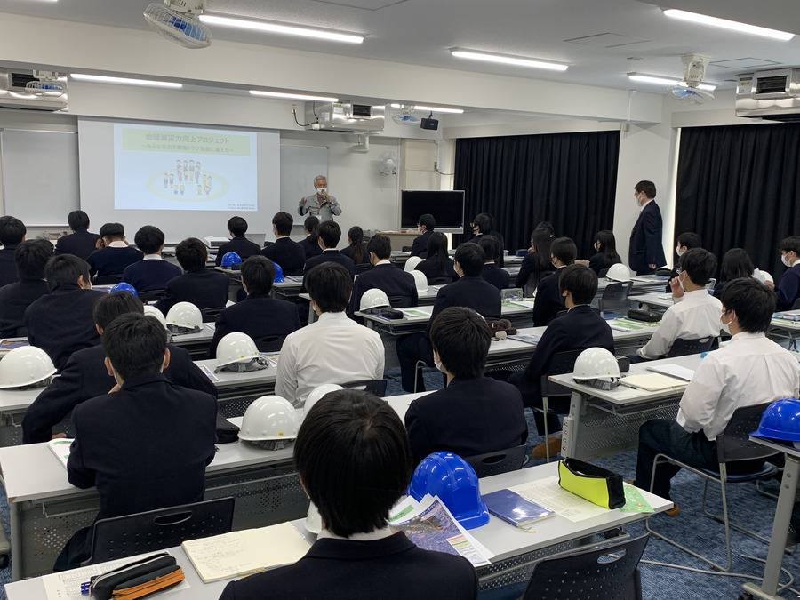 当日は、現在当社が施工中である「(新)安芸中学校・高等学校校舎棟新築主体工事」の野口現場所長より「被害を減らす建物づくり」などの説明を行い、続いてNPO法人減災教育普及協会(神奈川県)の江夏理事長より