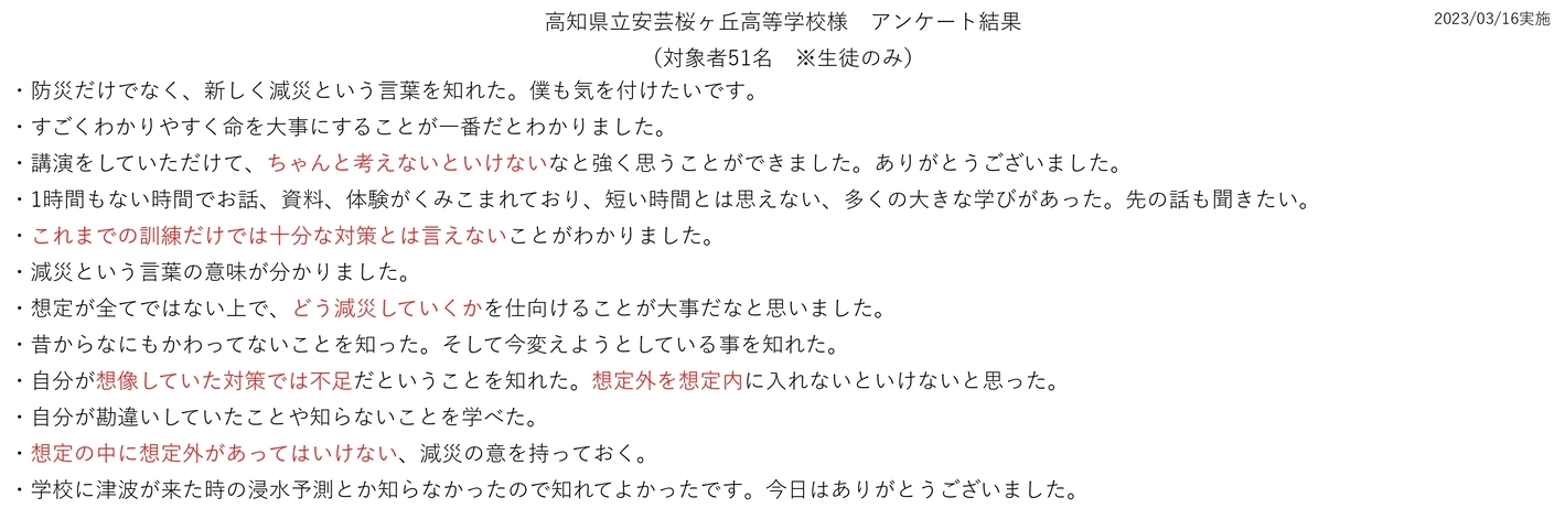 令和5年3月16日に高知県立安芸桜ケ丘高校 1・2年生 51名、教員 9名に参加いただき、防災・減災出前授業を開催いたしました。